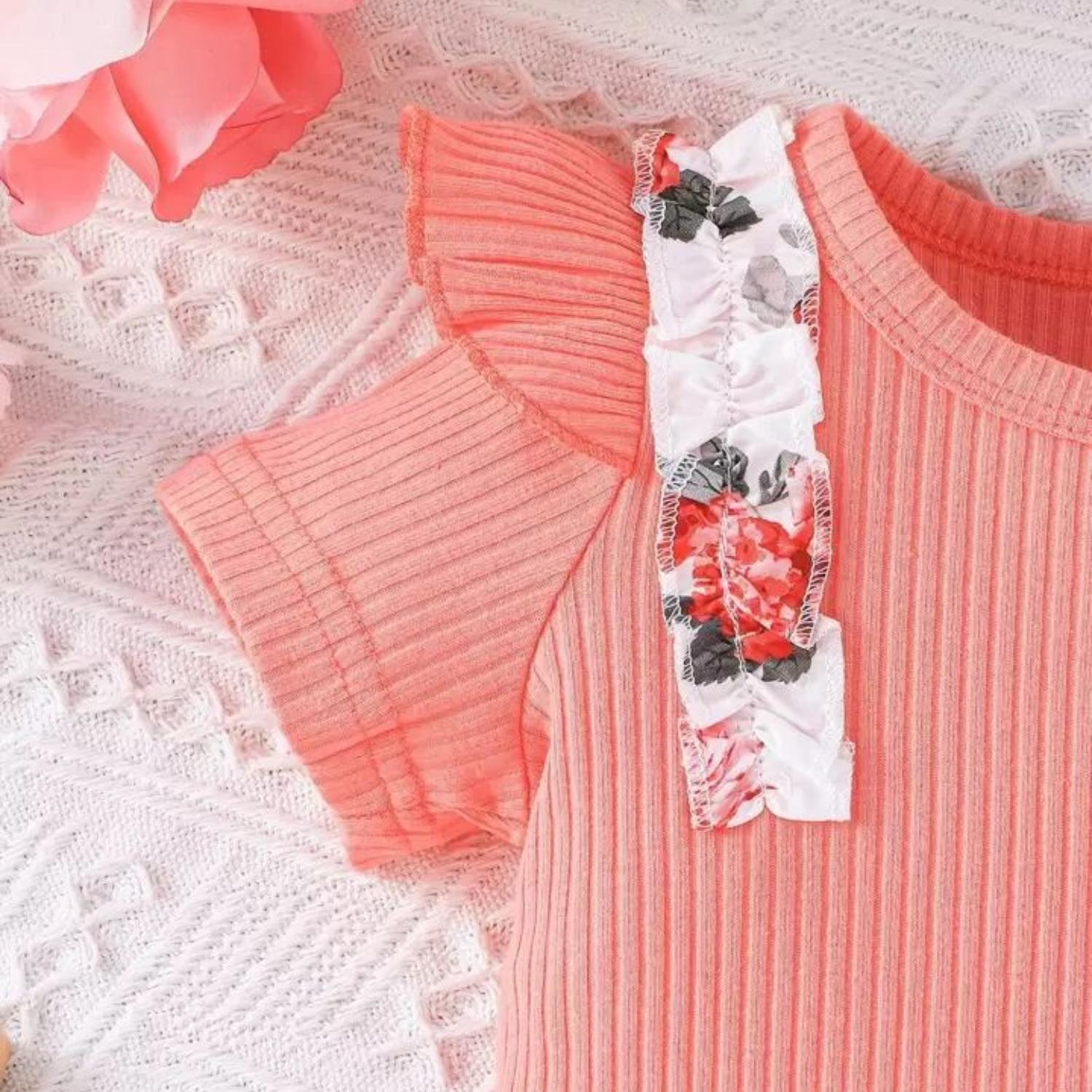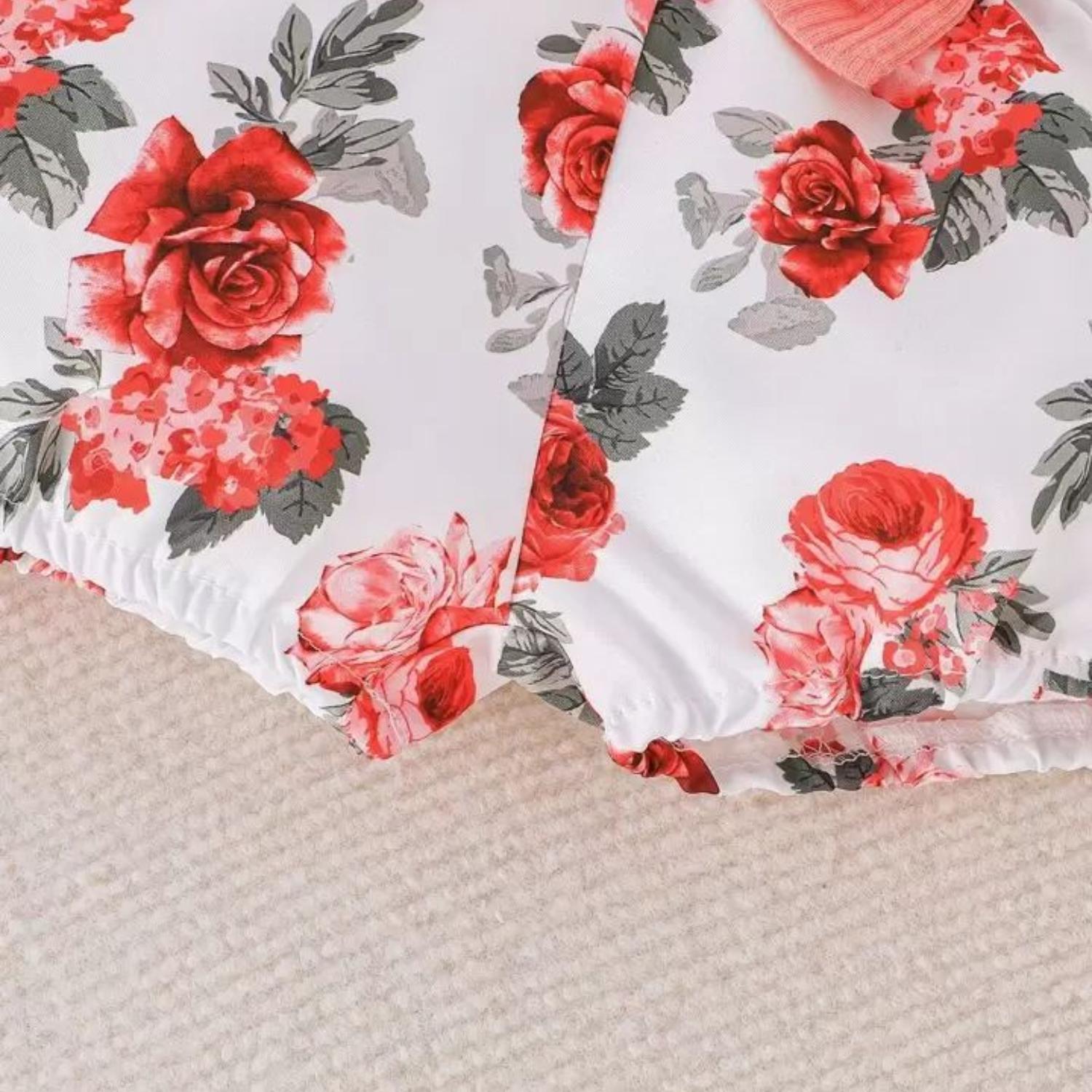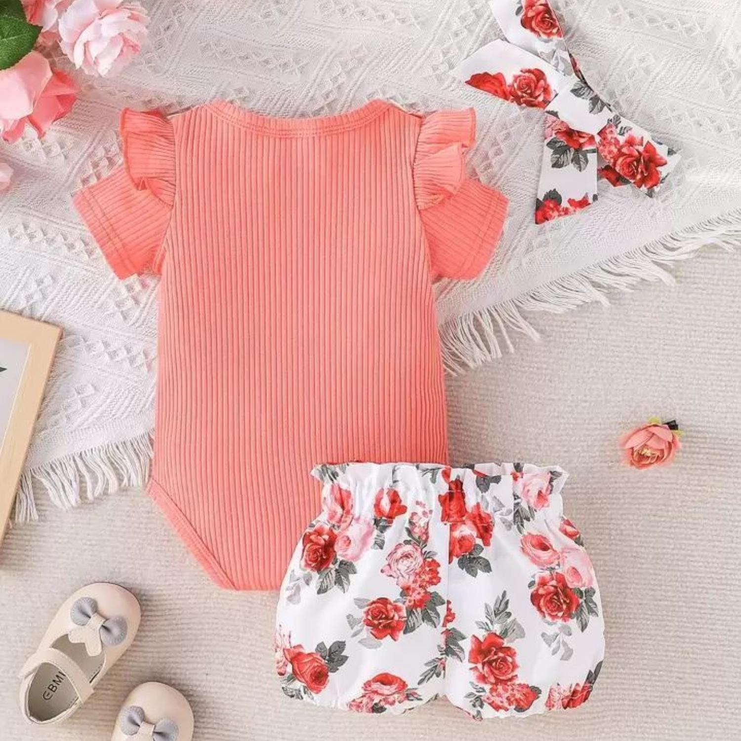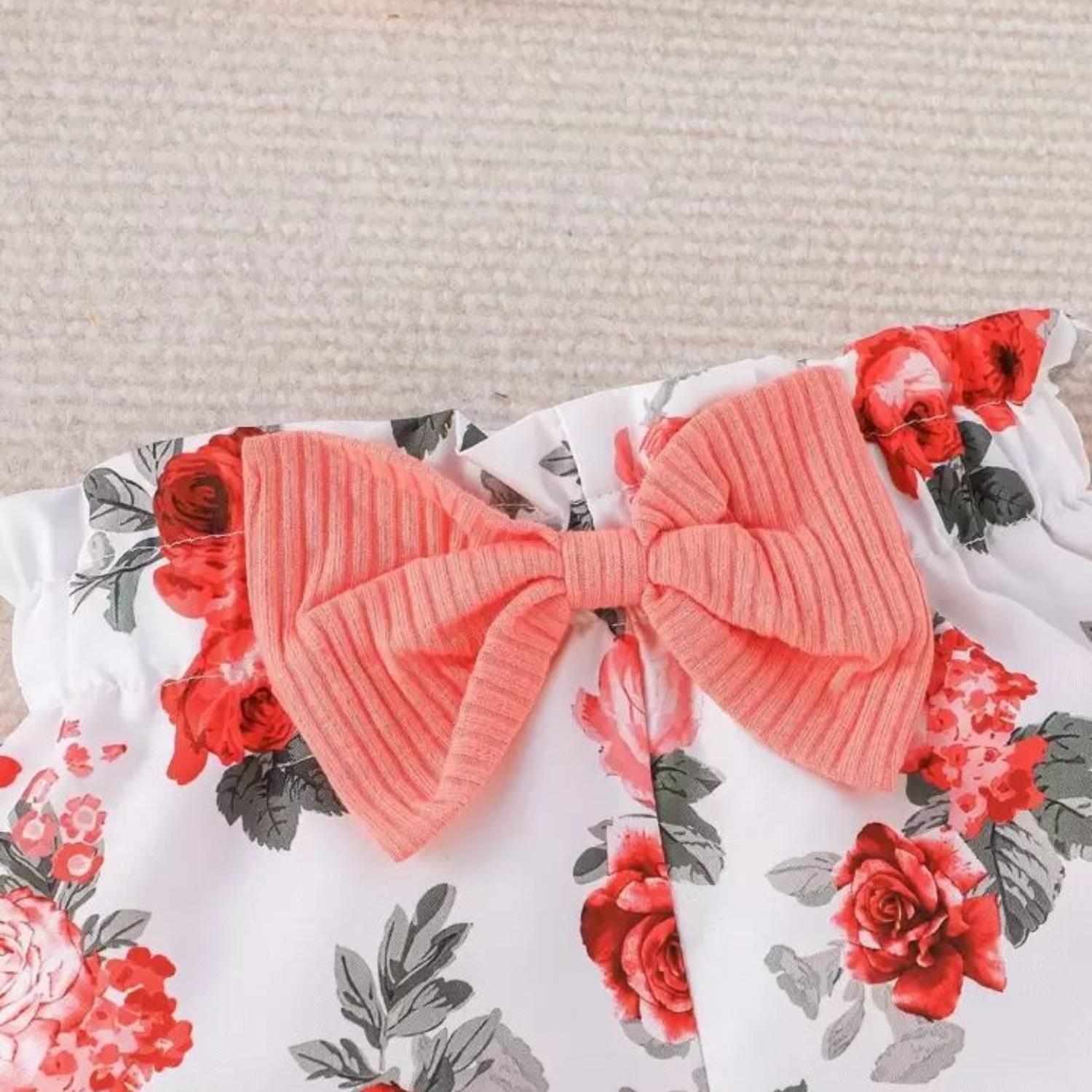 Conjunto Para Niña De 3 Prendas Body Rosado Manga Corta + Short Y Lazo Estampado Rosas CJ063