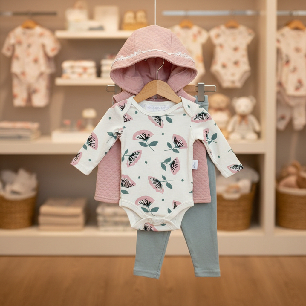 Conjunto De 3 Prendas Body Manga Larga + Chaqueta Con Capucha Rosado + Calza Gris CJ175
